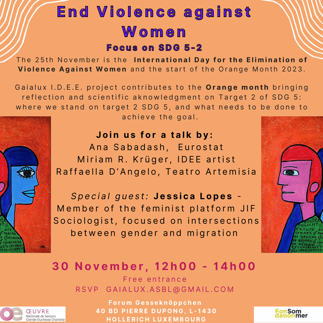 Join our talk on target 2 of #sdg5 , Thursday 30 November at 12h00 – 14h00. Eurostat expert Ana Sabadash, will present where we are in terms of Indicators in Luxembourg and Europe. I.D.E.E. artist Miriam R. Krüger and Raffaella D’Angelo of Artemia Theatre will bring a creative and artistic perspective on the topic. Jessica Lopes member of the feminist platform #jif_luxembourg will guide us through an understanding of social dynamics and gender relations in Luxembourg today. Free entrance; RSVP gaialux.asbl@gmail.com