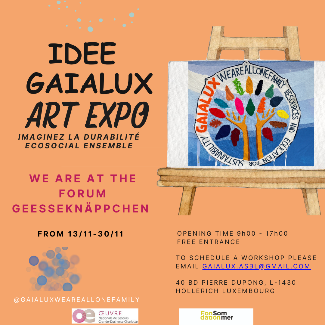 Join us at the #IDEEartexpo’ by Gaialux at the #forumgesseknapchen from the 13th of November till the 30th of November (free entrance – email @gaialuxweareallonefamily for workshops and groups). We can’t wait to see you there. Get inspired for change! Let’s shape together more responsible and just communities